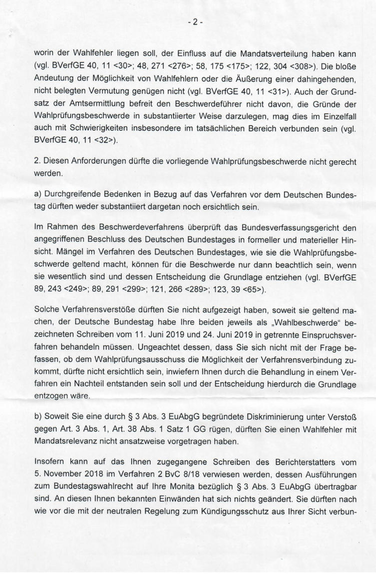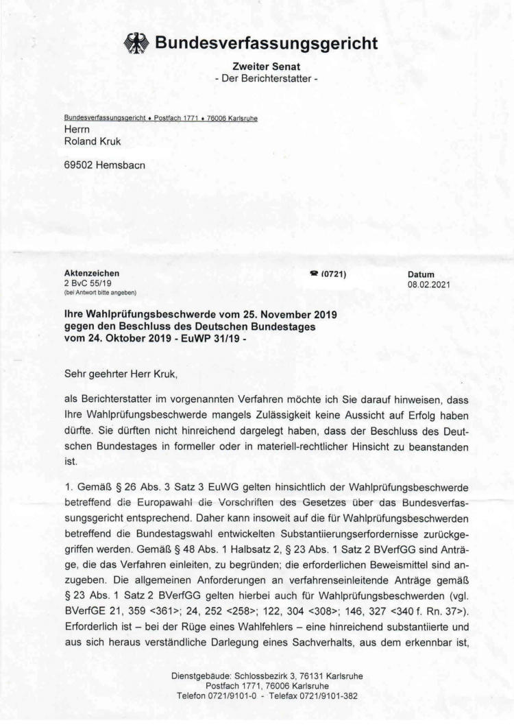 Wahlprüfungsbeschwerde EuWP 31/19 wird zu 2 BvC 55/19 Wahlprüfungsbeschwerde EuWP 31/19 wird zu 2 BvC 55/19